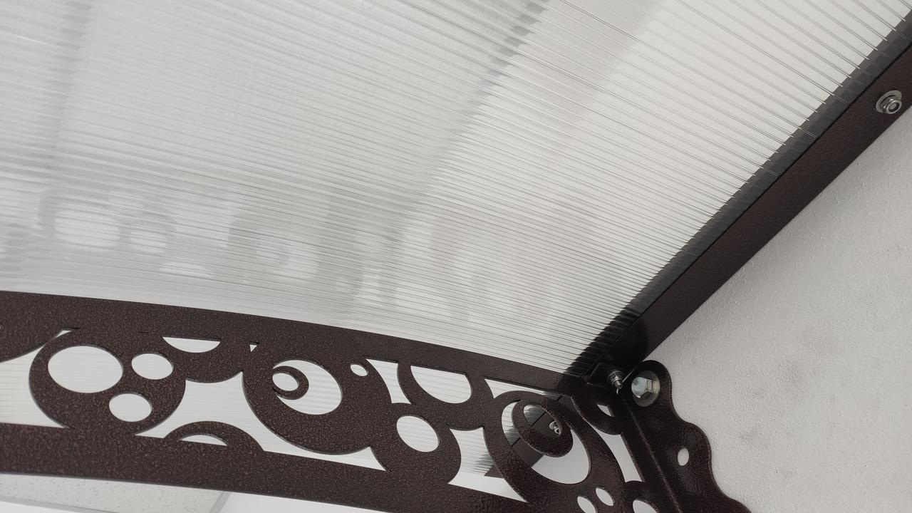 Виготовлений з високоякісного полікарбонату, цей навіс є міцним та стійким до ультрафіолетових променів, що забезпечує тривалий термін служби без вигорання або пошкоджень. Полікарбонат також має високу прозорість, дозволяючи достатньо природного світла проникати до входу.