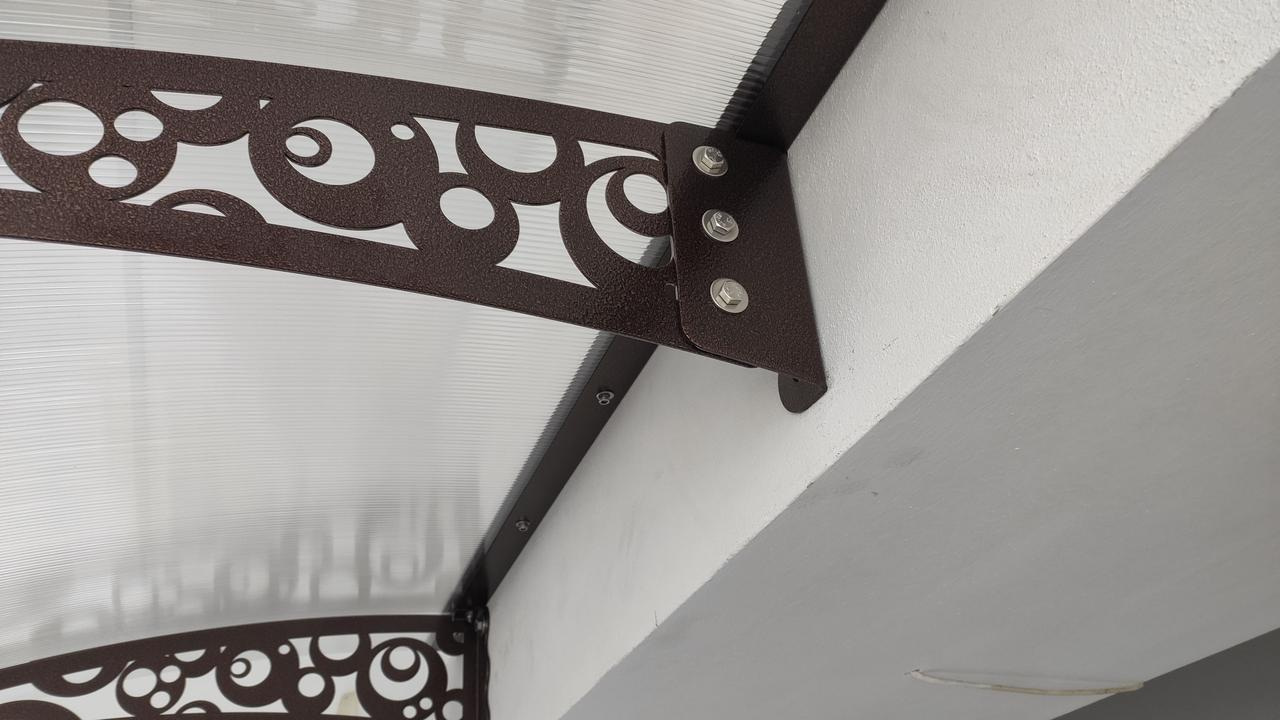 Виготовлений з високоякісного полікарбонату, цей навіс є міцним та стійким до ультрафіолетових променів, що забезпечує тривалий термін служби без вигорання або пошкоджень. Полікарбонат також має високу прозорість, дозволяючи достатньо природного світла проникати до входу.